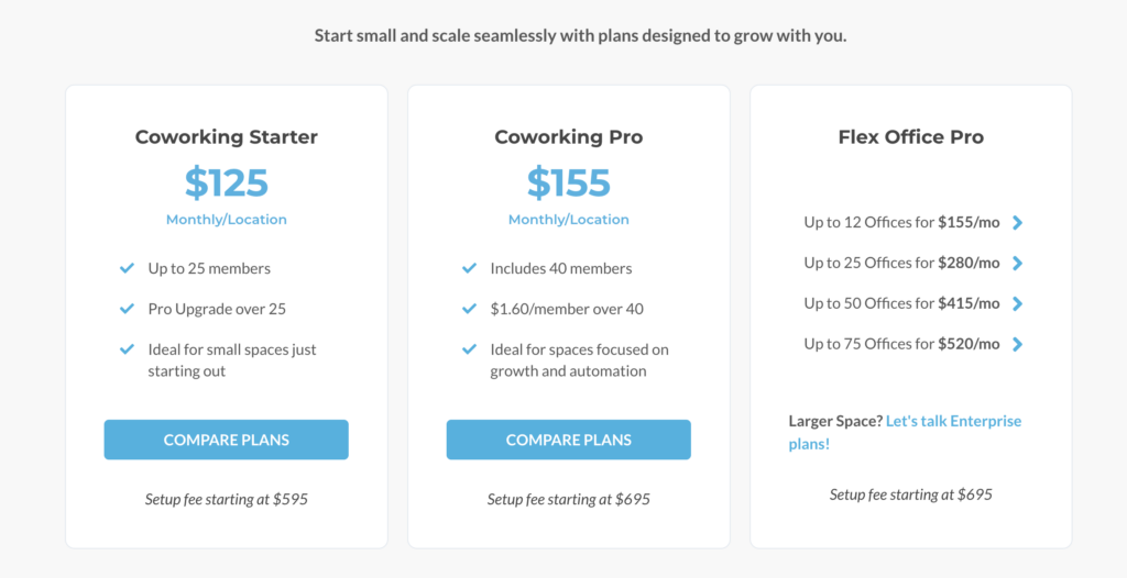 OfficeRnD Flex is now mainly quote-based (it used to start from $165/month for a single location with 100 members). It still lists a few plans, though: