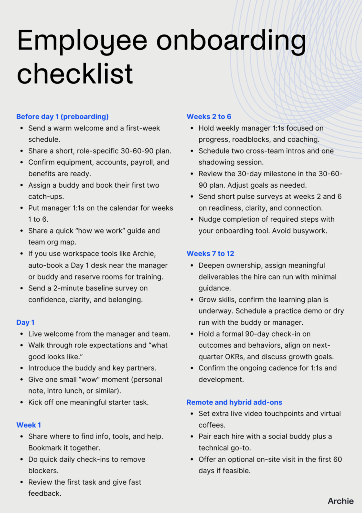 Bottom line: good software amplifies what great onboarding already does well. For example, tools like Archie can make the first weeks smoother by auto-booking a Day 1 desk near the manager or buddy, reserving rooms for training and team huddles, and sharing office maps and seating neighborhoods. That kind of physical setup makes it easier to meet people and get meaningful work done.