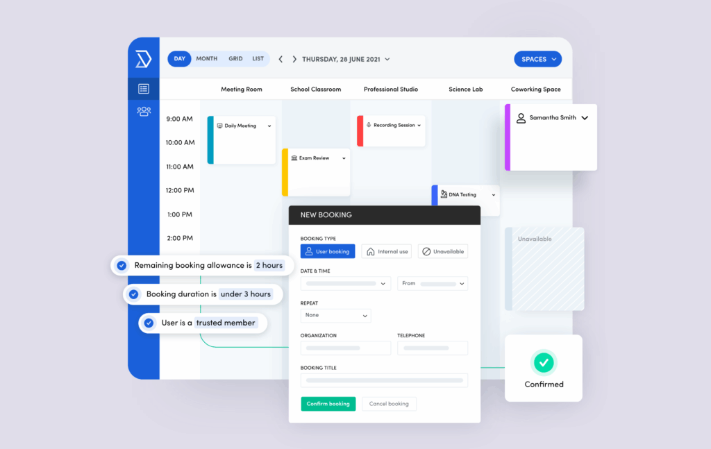 - Customizable booking rules: It’s easy to customize the system’s Scheduling Automation. Admins can define complex policies, such as setting quotas, defining check-in requirements, applying time limits, or restricting access based on user roles and tags.