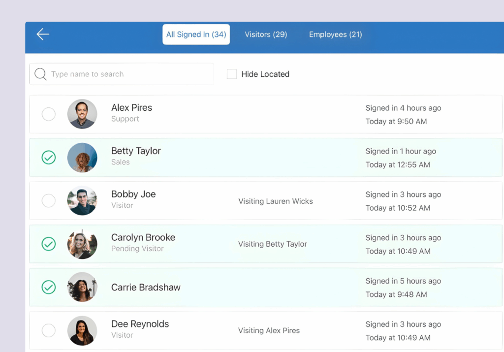 During evacuations, admins can use the SwipedOn app to mark employees as safe, getting not only a clear view of the day’s visitors, but also who is currently still left in the building or worksite.